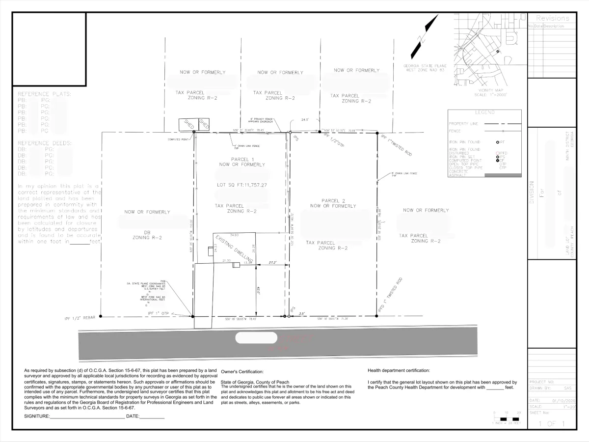 I turn your field work into subdivision plats that meet county standards. Proper line tables, curve data, legal descriptions - all the details that take forever when you're trying to get back in the field.